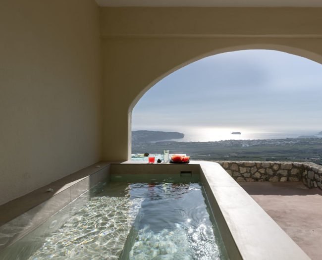 Exquisite suites boasting an outdoor or indoor private jacuzzi with breathtaking sea views, designed for ultimate relaxation and romance