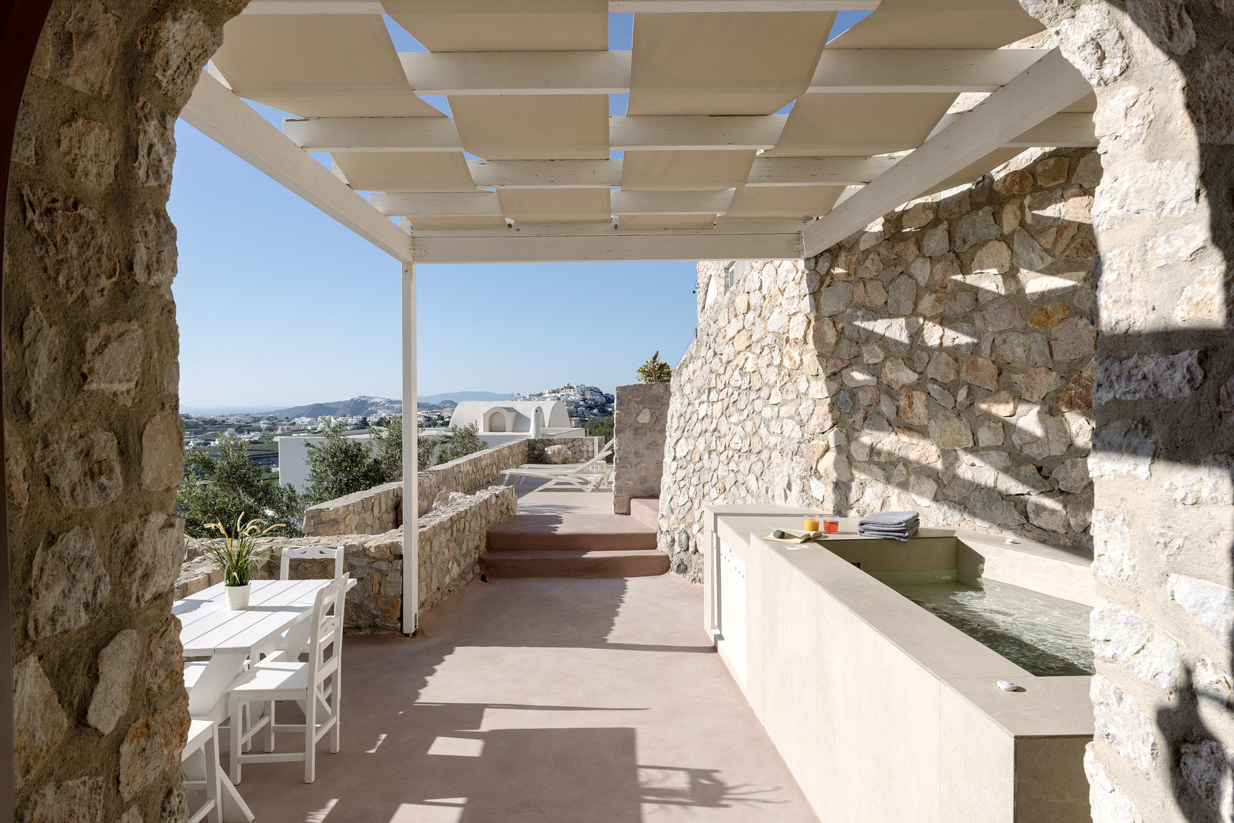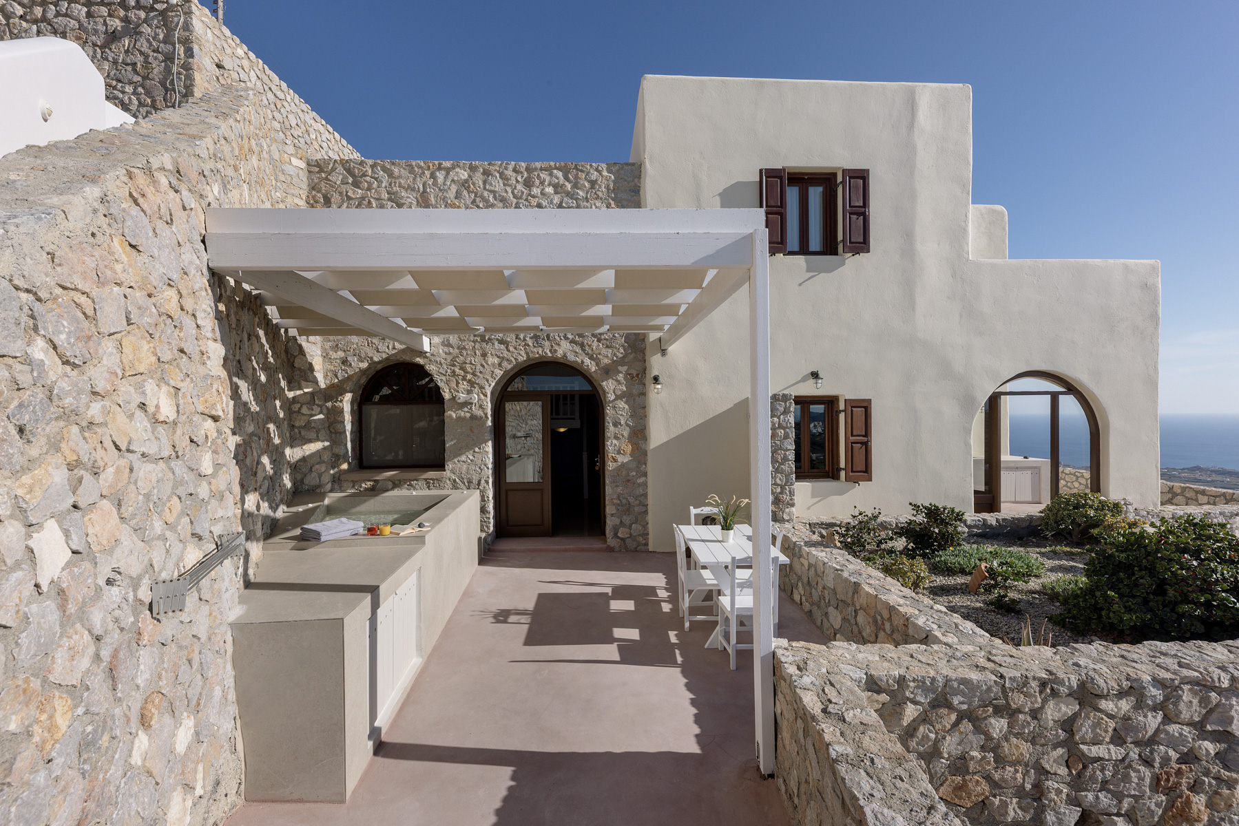 Απολαύστε το ηλιοβασίλεμα της Σαντορίνης ενώ βυθίζεστε σε μια αναζωογονητική εμπειρία στο θερμαινόμενο jacuzzi σας – είτε εσωτερικού είτε εξωτερικού χώρου.