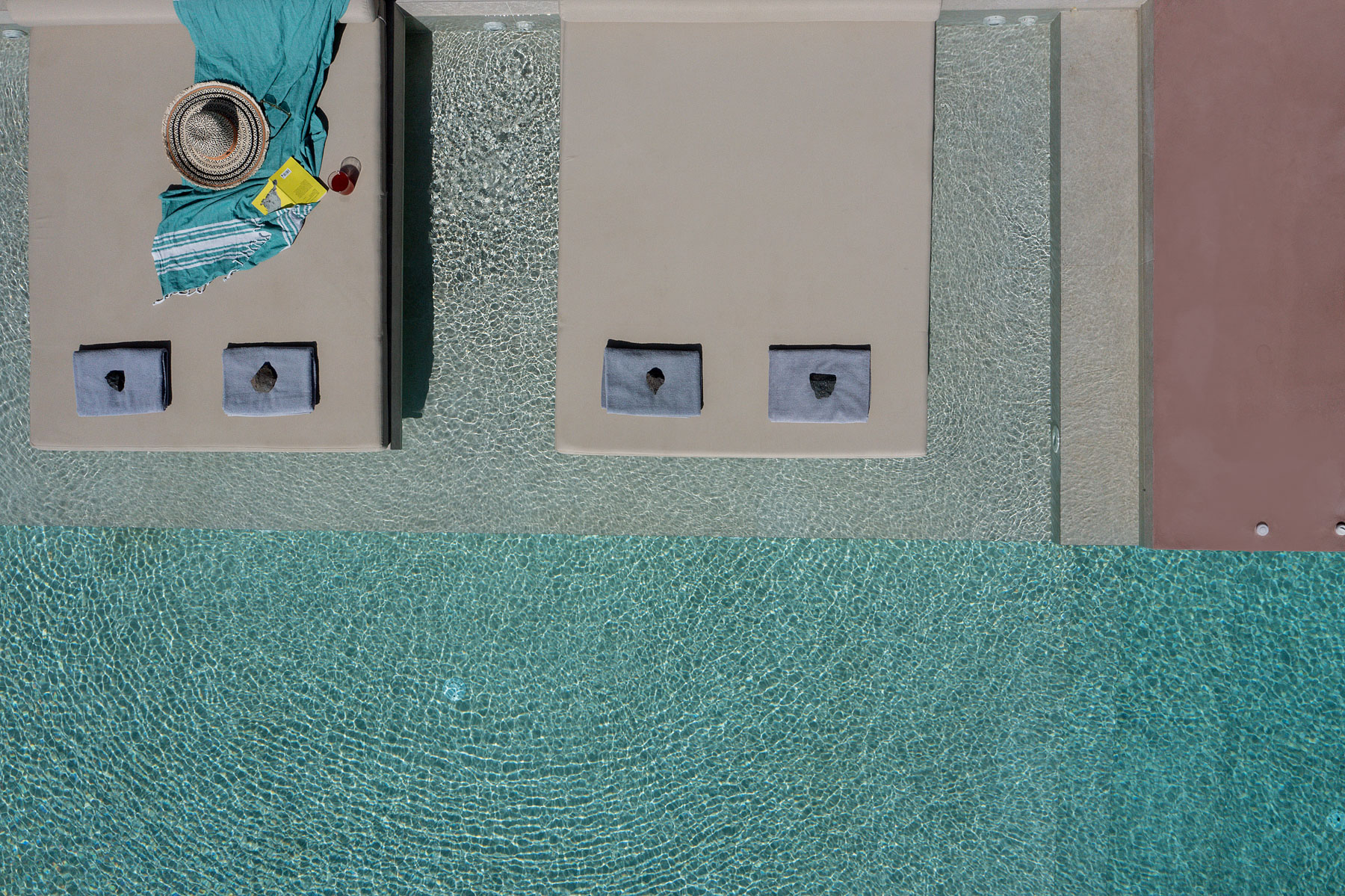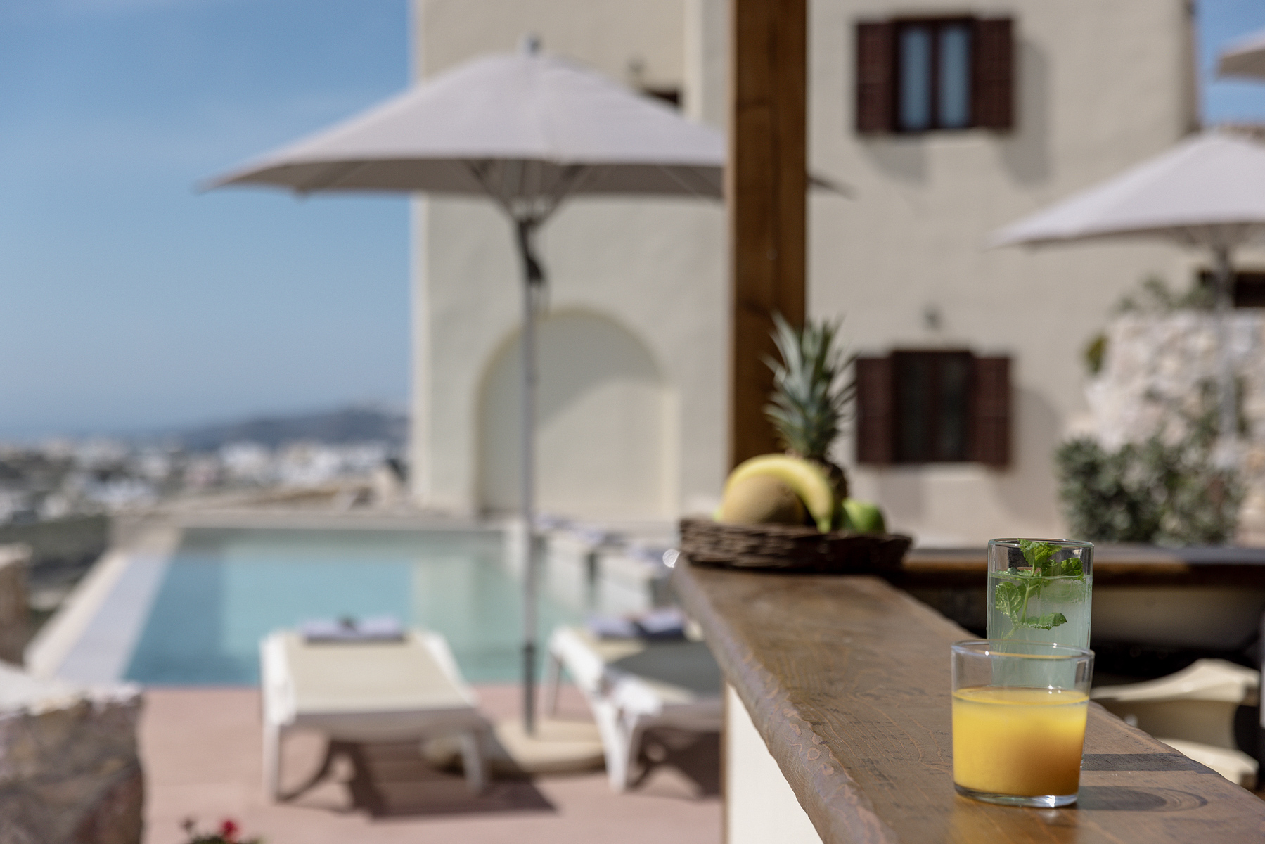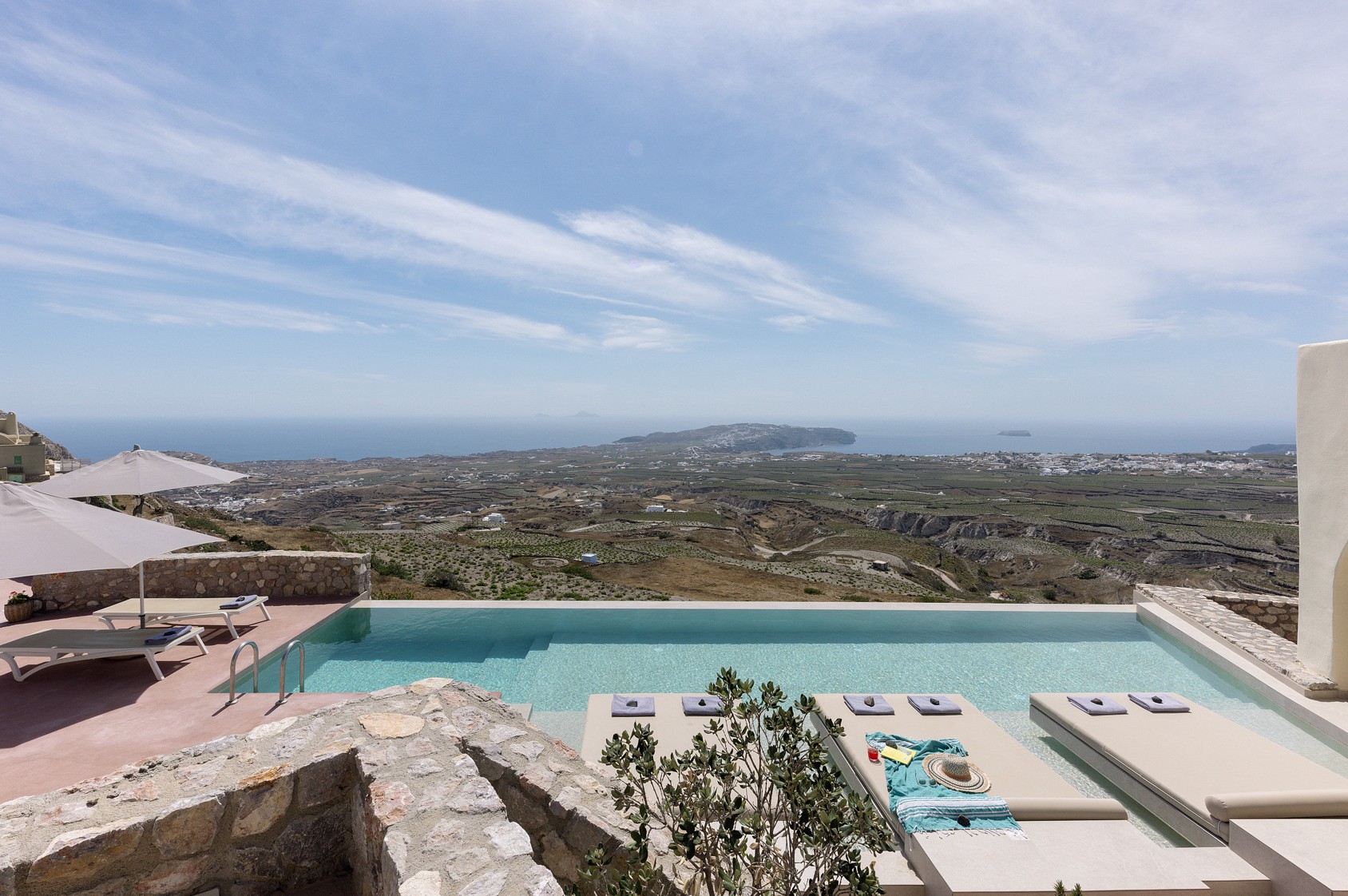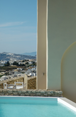 Στο μπροστινό μέρος, απλώνεται η μεγάλη, οικολογική πισίνα που δίνει την αίσθηση ότι ο ουρανός και η θάλασσα ενώνονται σε ένα σύνολο.